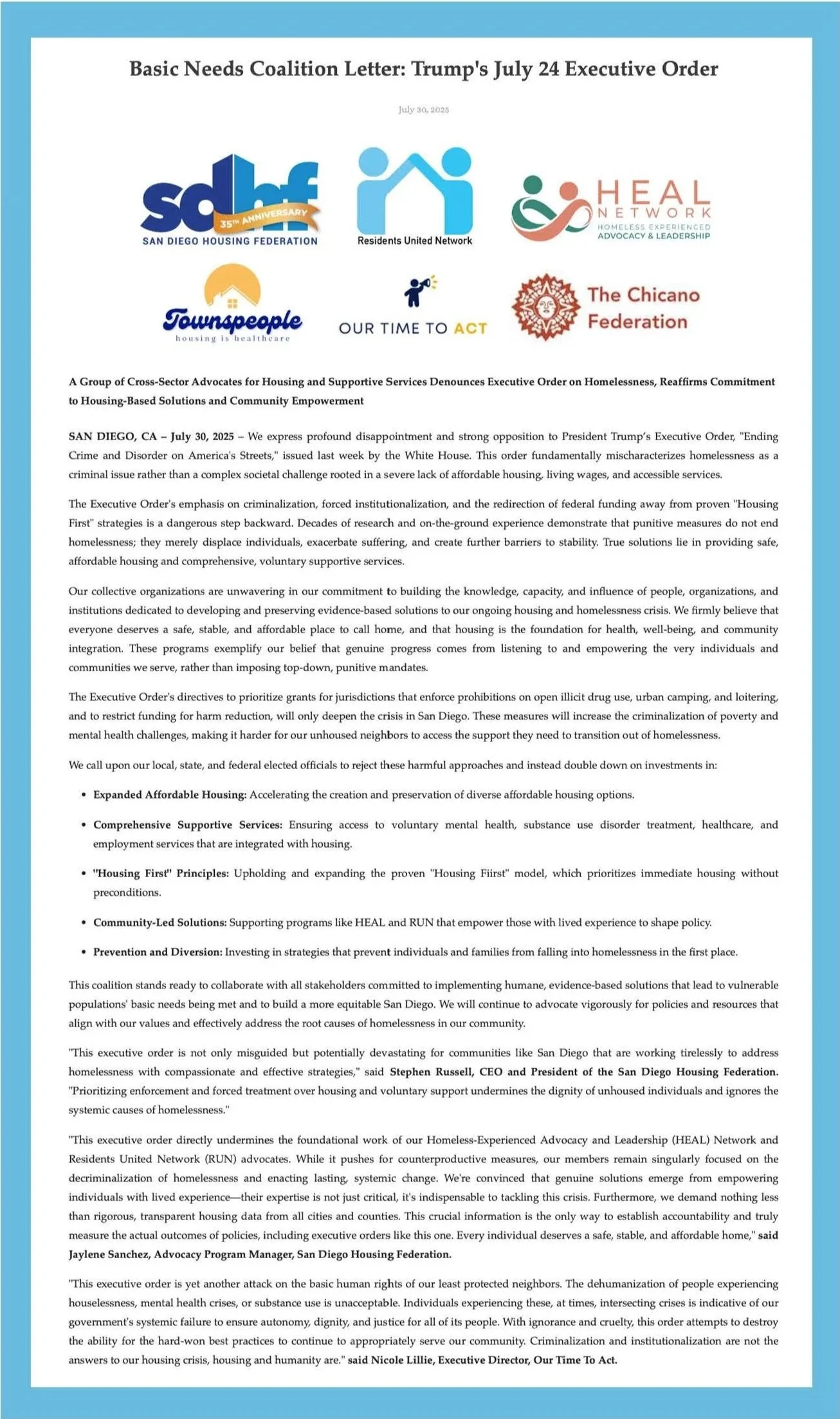 “We are having emergency meetings within our sector on a weekly basis with our resident service providers to talk about what is happening with food, with medical care, with rent, with any other supports, with child care. We are seeing, one by one, the supports that families rely on to thrive are being taken away. This is painful.” — San Diego Housing Federation, President and CEO, Stephen Russell